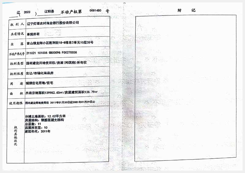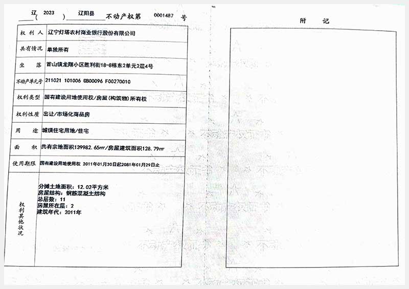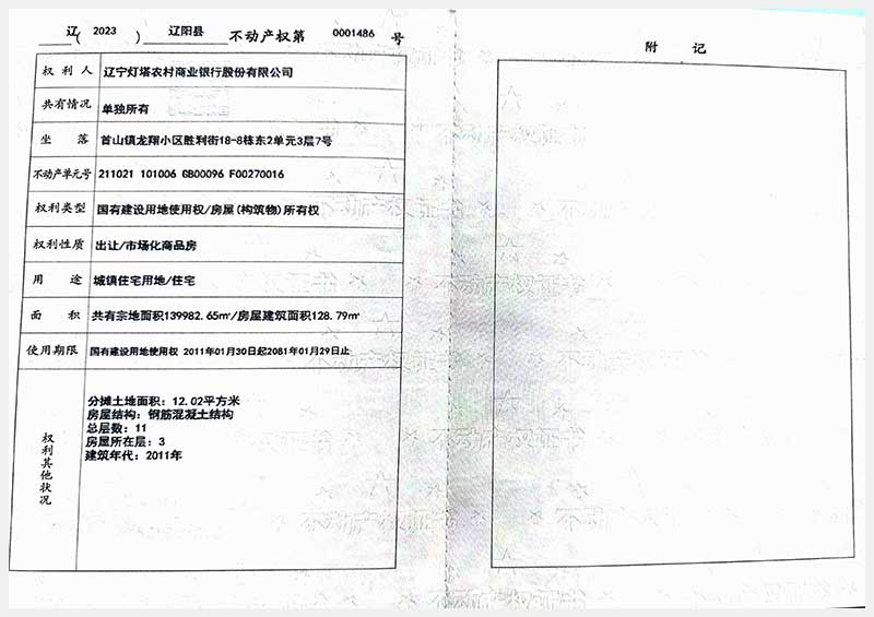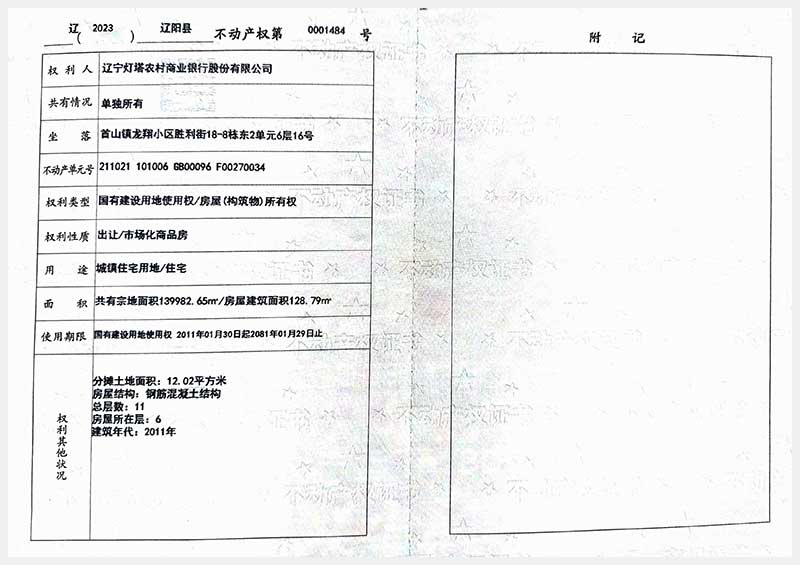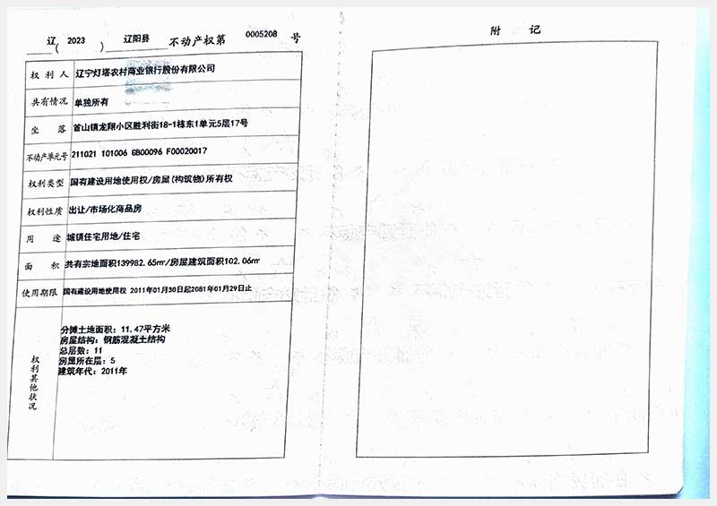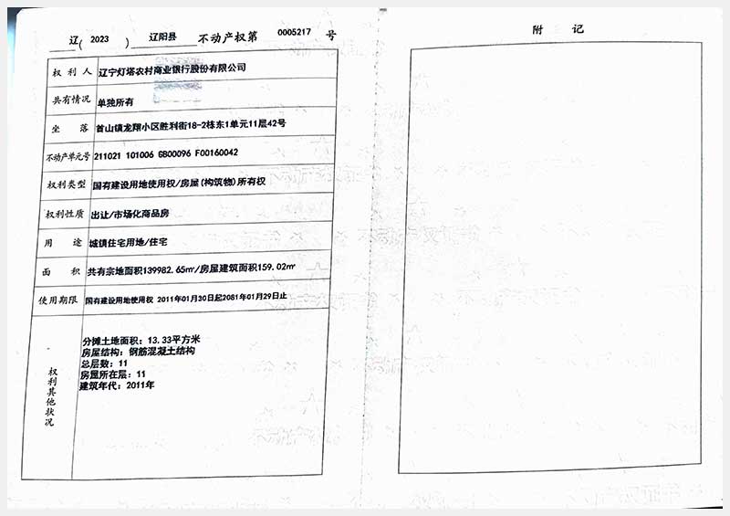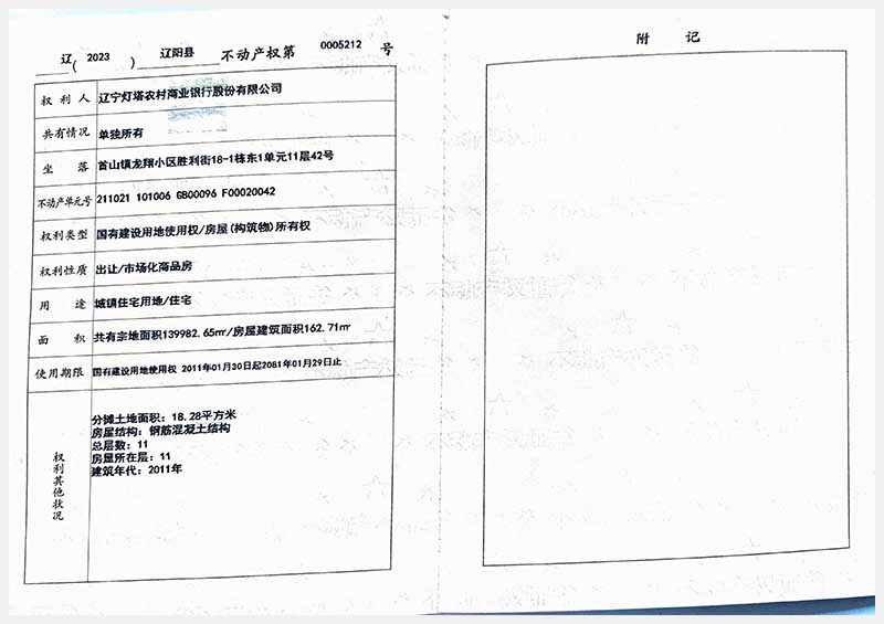 名稱:遼陽市首山鎮(zhèn)龍翔小區(qū)勝利街18棟房產(chǎn) 面積:102.06㎡—162.71㎡ 瀏覽次數(shù):328